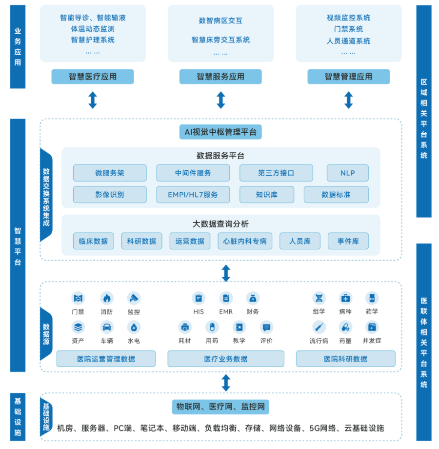 愛迪科技智慧醫療解決方案聚焦醫院服務場景和流程需求,對醫院的實體空間進行數字化升級,以AI視覺中樞管理平臺為核心,接入醫院專有業務系統、安防、消防等各應用子系統,形成醫院綜合管控一體化平臺,對院區的人員、車輛、物資實行全方位、多業務的融合智能管理,全面提升醫院的管理能力、服務能力、安全防護能力,降低運營成本,為醫患提供安心的診療環境提高診療效率,緩解醫患矛盾。